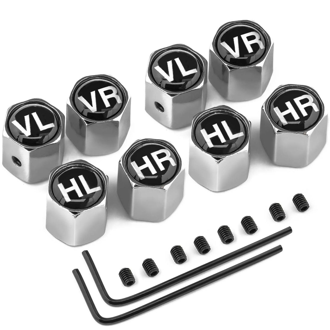 Schrauben Sie die praktischen und abschließbaren Kappen einfach auf Ihr Reifenventil. Dank der Sechskantschrauben können Sie die Kappen fixieren und gegen unbefugtes aufschrauben sichern. Die aufgedruckte Reifenmarkierung lautet wie folgt: VL / HL / VR / HR
