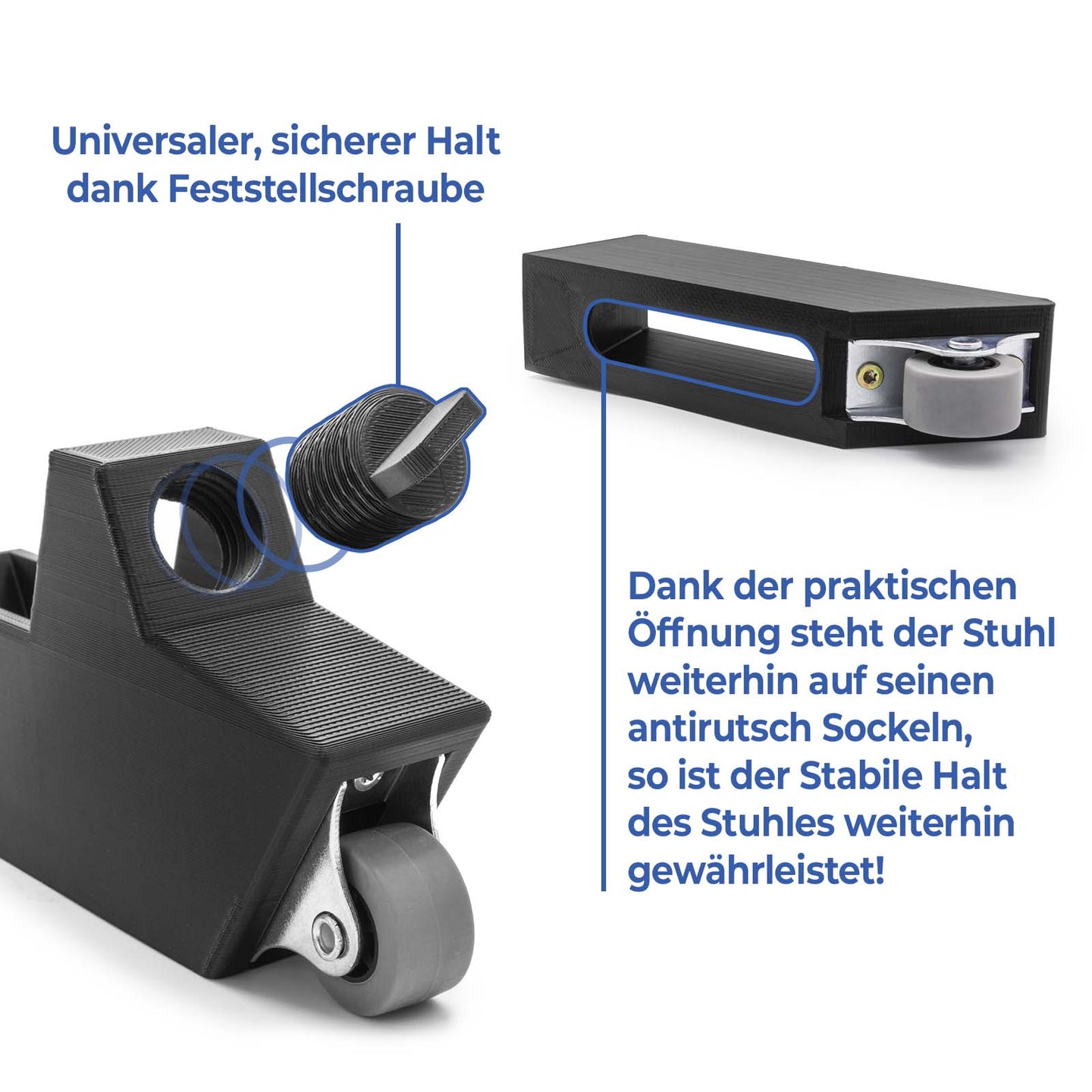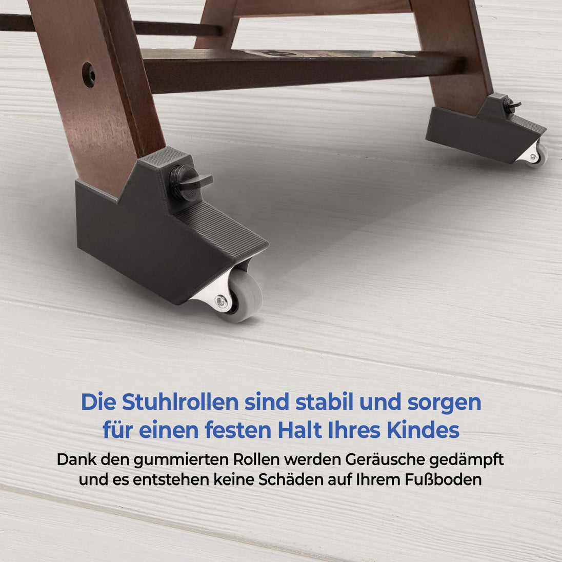 Dank unserer Aufsteckrollen inkl. Feststellschrauben können Sie Ihren Hochstuhl im Handumdrehen nachrüsten ohne auf die Standfestigkeit & Kippsicherheit verzichten zu müssen.