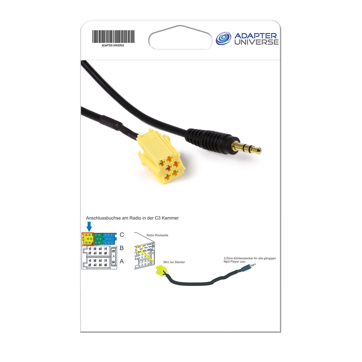 Dieses AUX-In Kabel von Adapter-Universe ermöglicht es Ihnen, eine externe Audio Quelle (z.B. DVD-Player, iPhone, iPod, iPad, Tablet, Smartphone, Laptop etc.) über die 6pol Mini ISO Buchse in Ihrem Auto anzuschließen.