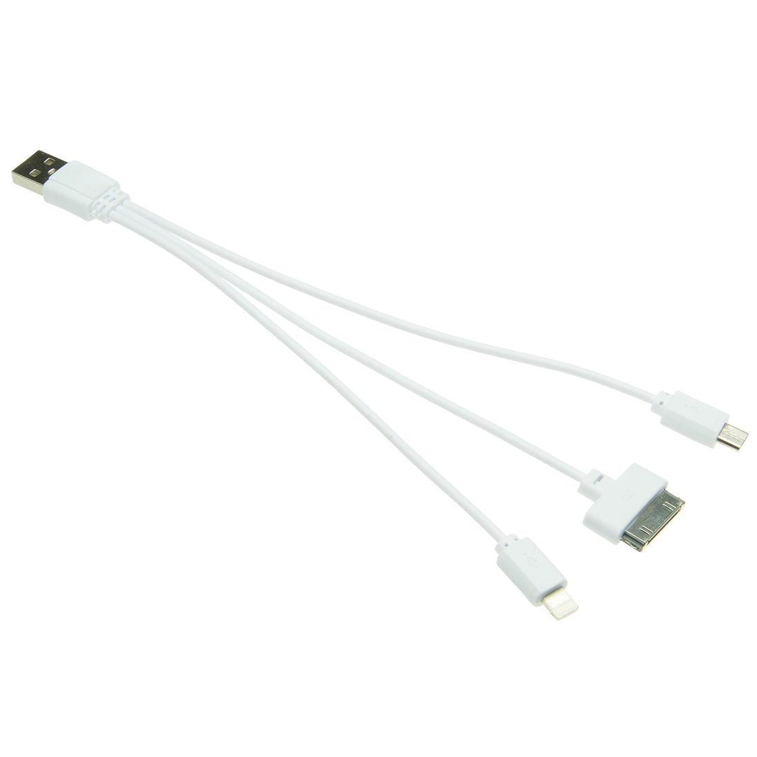 Mit dem 4in1 universal Ladekabel von Adapter-Universe haben Sie alle benötigten Ladeanschlüsse an einem Kabel. Das Aufladekabel verfügt über die drei gängigen Stecker: Lightning, Micro-USB und 30-pin auf USB, sodass verschiedene Geräte von einem Kabel geladen werden können.